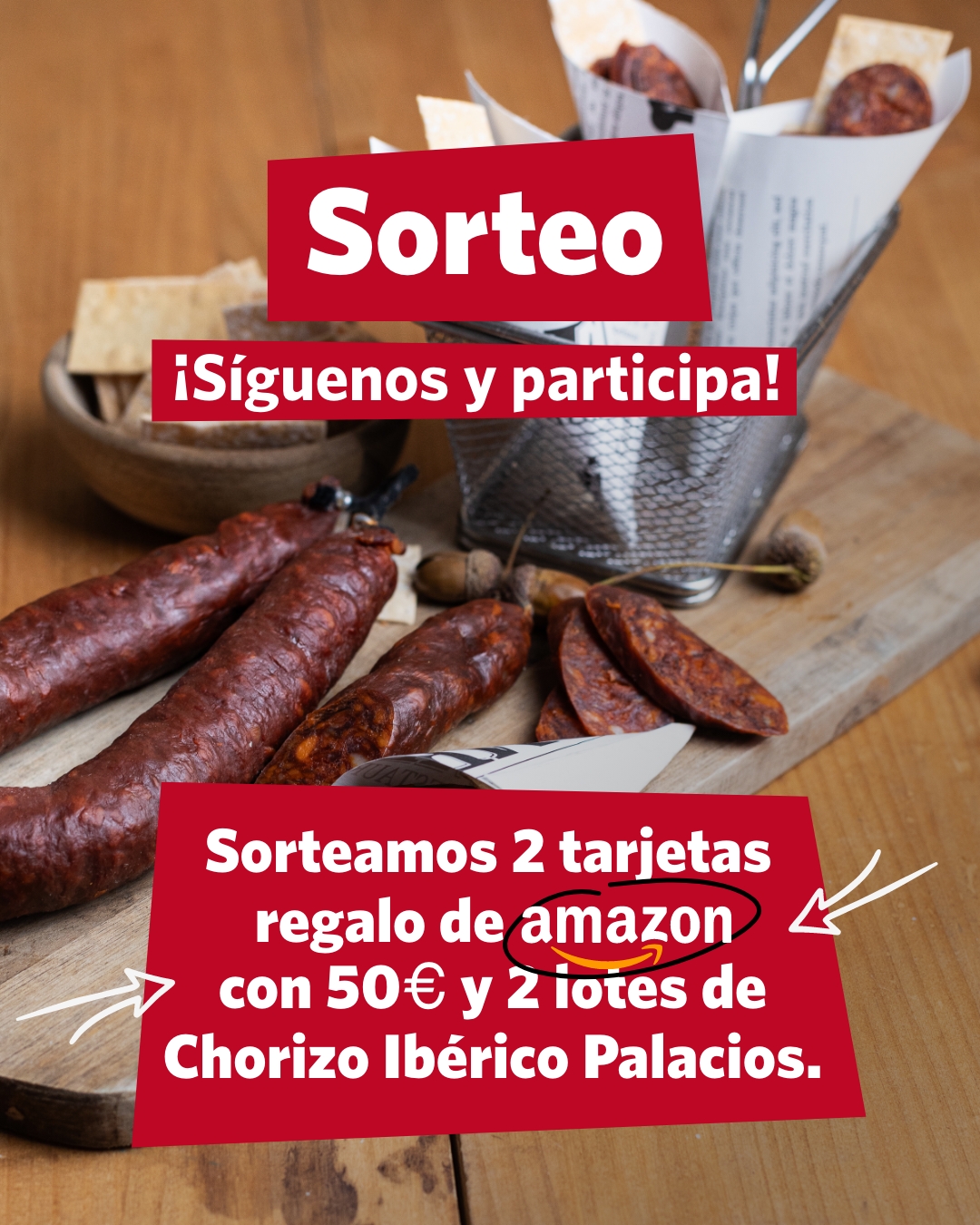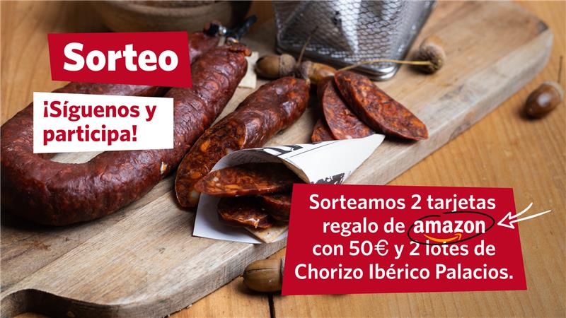 En Palacios Alimentación ya tenemos la mirada puesta en la Navidad y este año queremos ayudarte con los preparativos y las compras navideñas. Por eso, hemos lanzado un sorteo muy especial con el que podrás ganar una tarjeta de Amazon de 50 €, perfecta para adelantar tus regalos de Navidad, y un lote de nuestro chorizo más navideño: el ibérico.